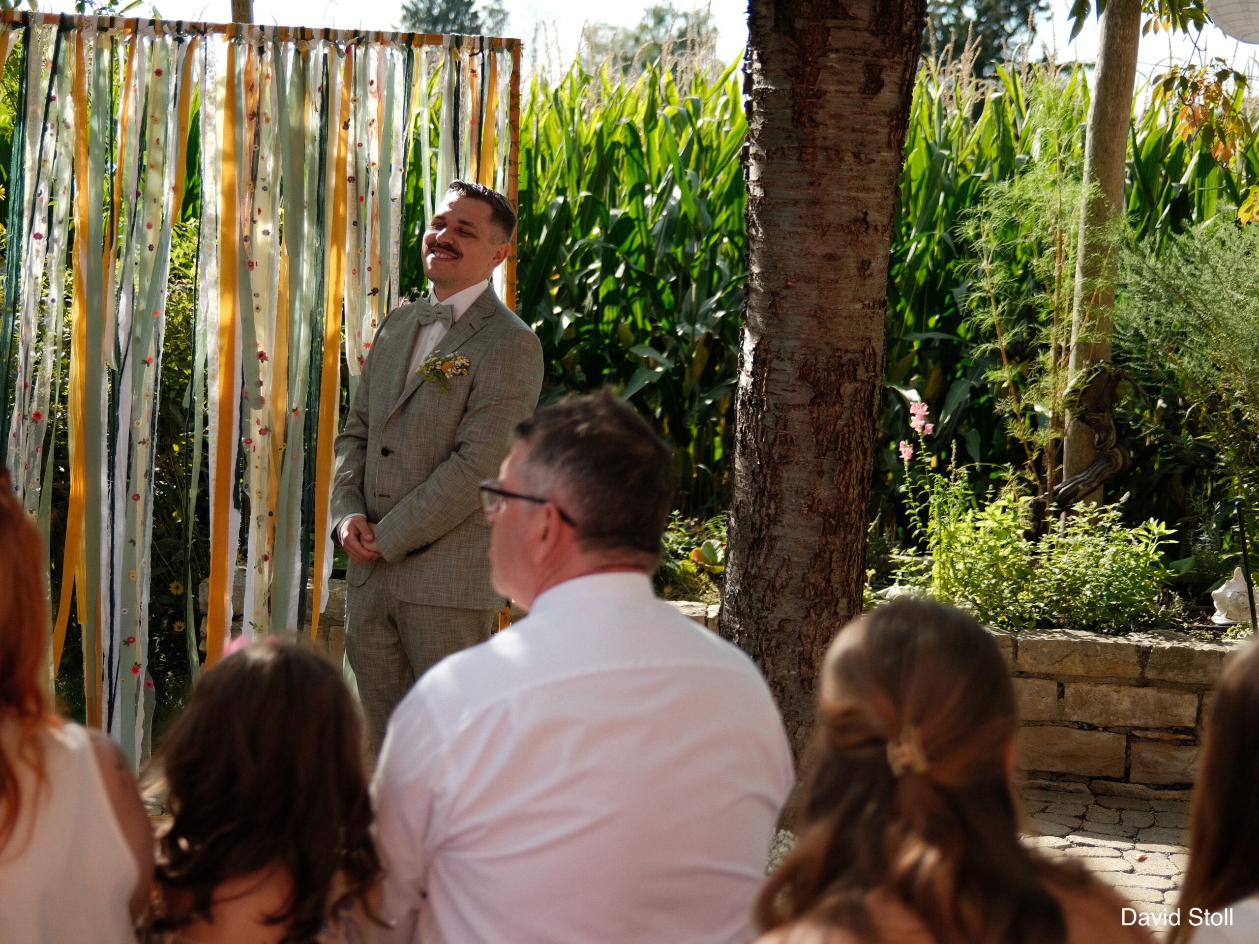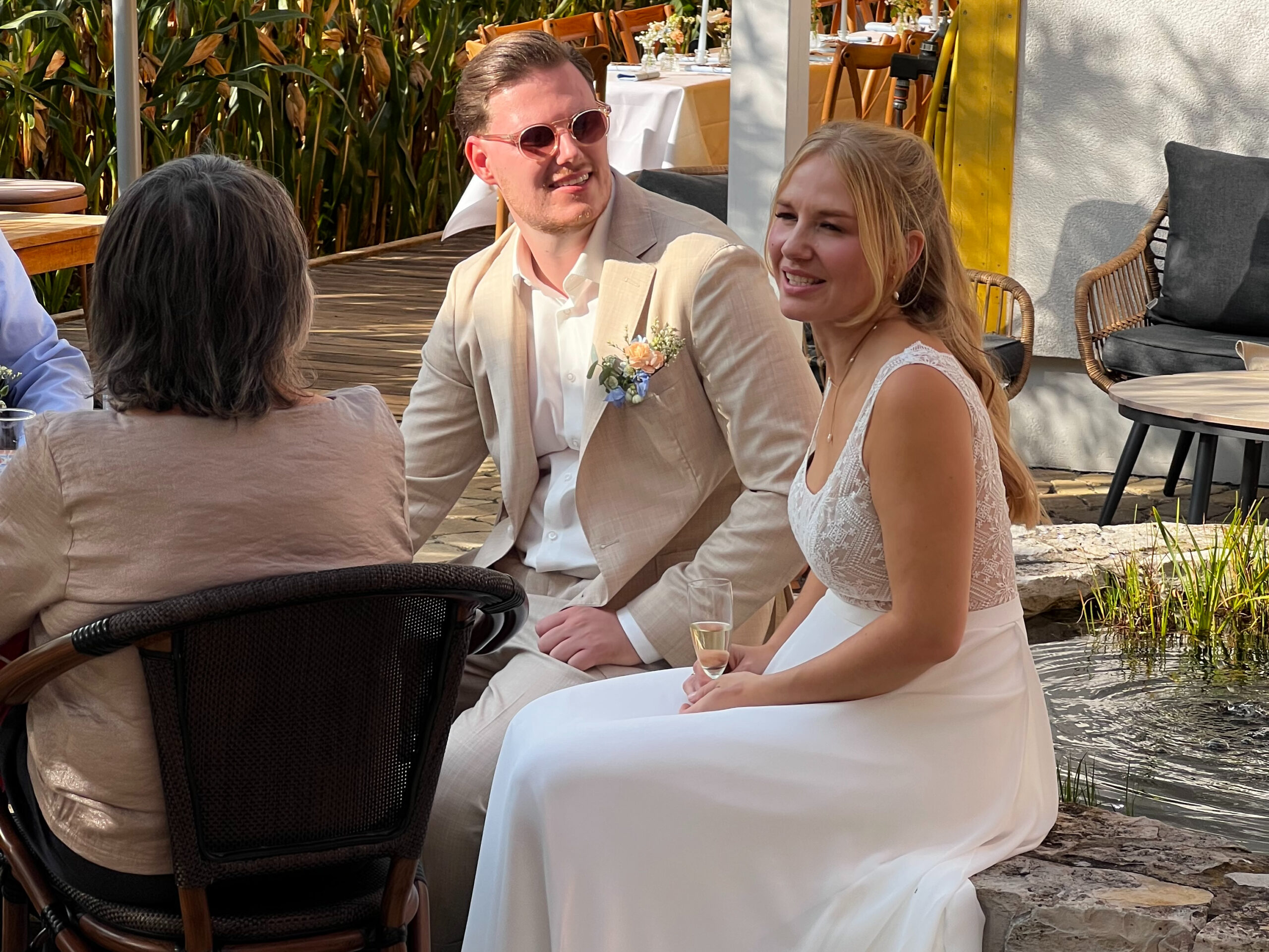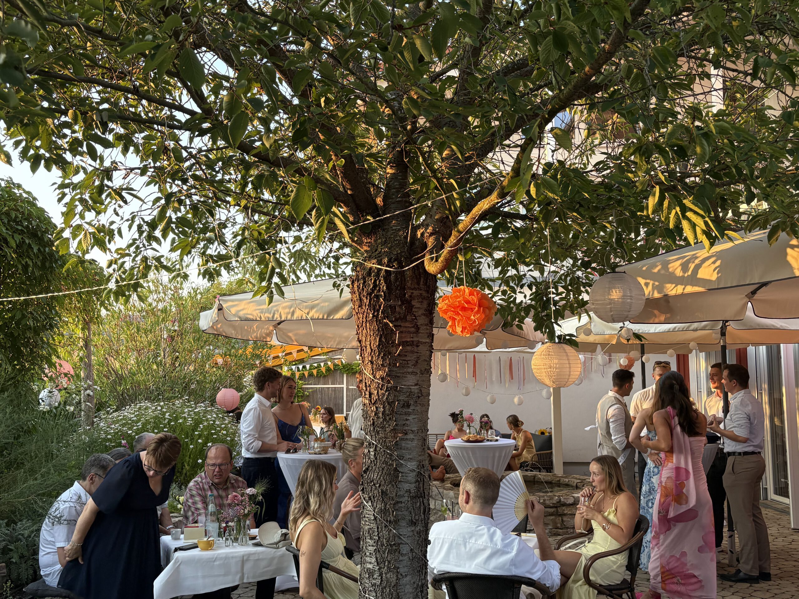 Unser wunderschön angelegter Innenhof mit mediterranem Flair, bunten Blumenbeeten und freiem Blick auf Felder und Reben bietet euch die perfekte Kulisse für eure Zeremonie. Sollte das Wetter einmal unbeständig sein, sorgt unsere großzügige Sonnenterrasse für eine stilvolle Alternative: überdacht, mit Markise und seitlich absenkbaren Wind- und Regenschutzwänden – so bleibt ihr trocken, seid trotzdem draußen und könnt die besondere Atmosphäre genießen.